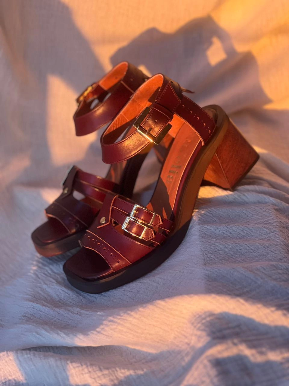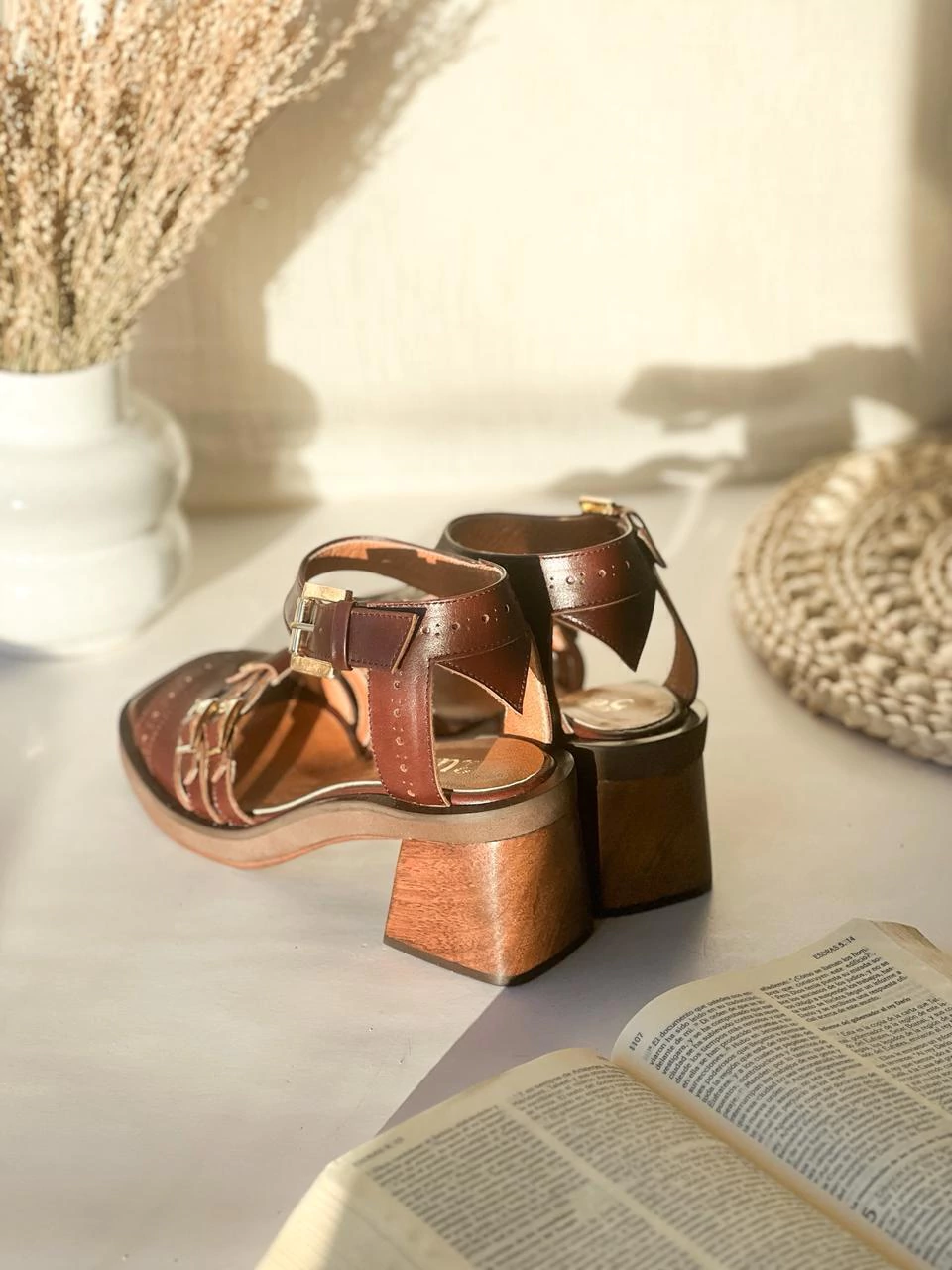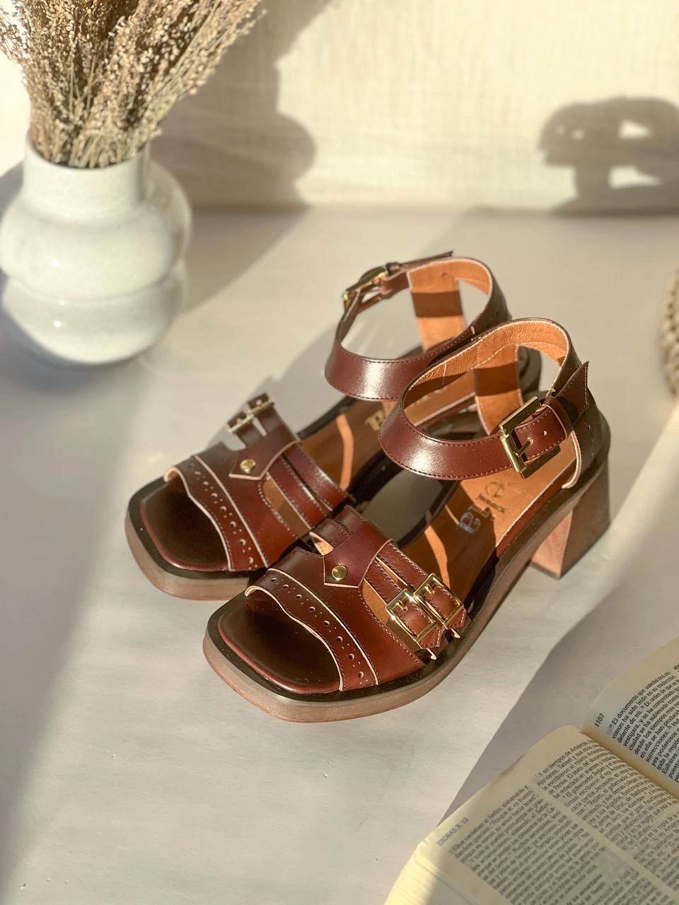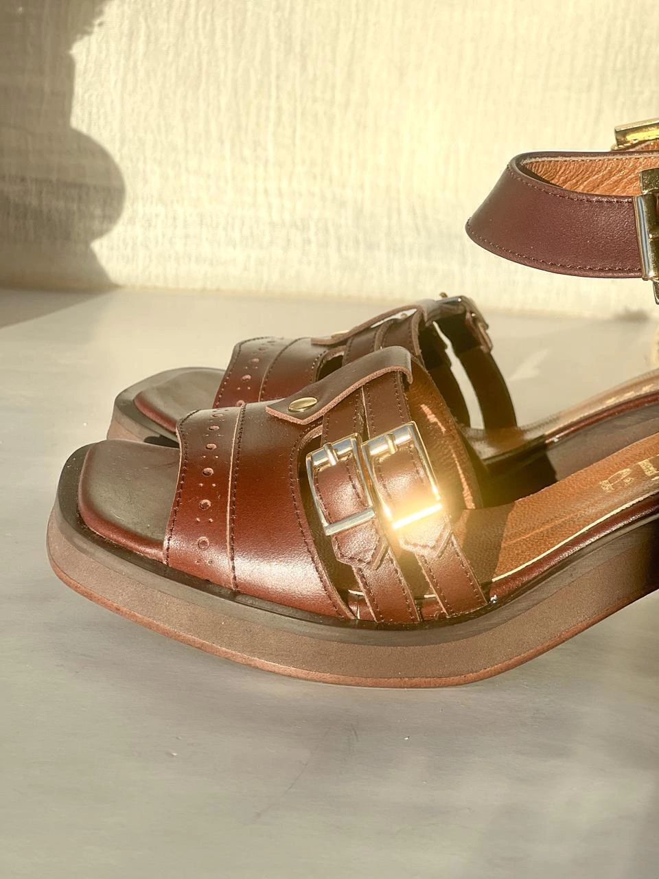 Sandalia con capellada ondeada en la punta, con calado y dos tiras con hebillas baño oro; confeccionada en cuero vacuno suela lustrado.